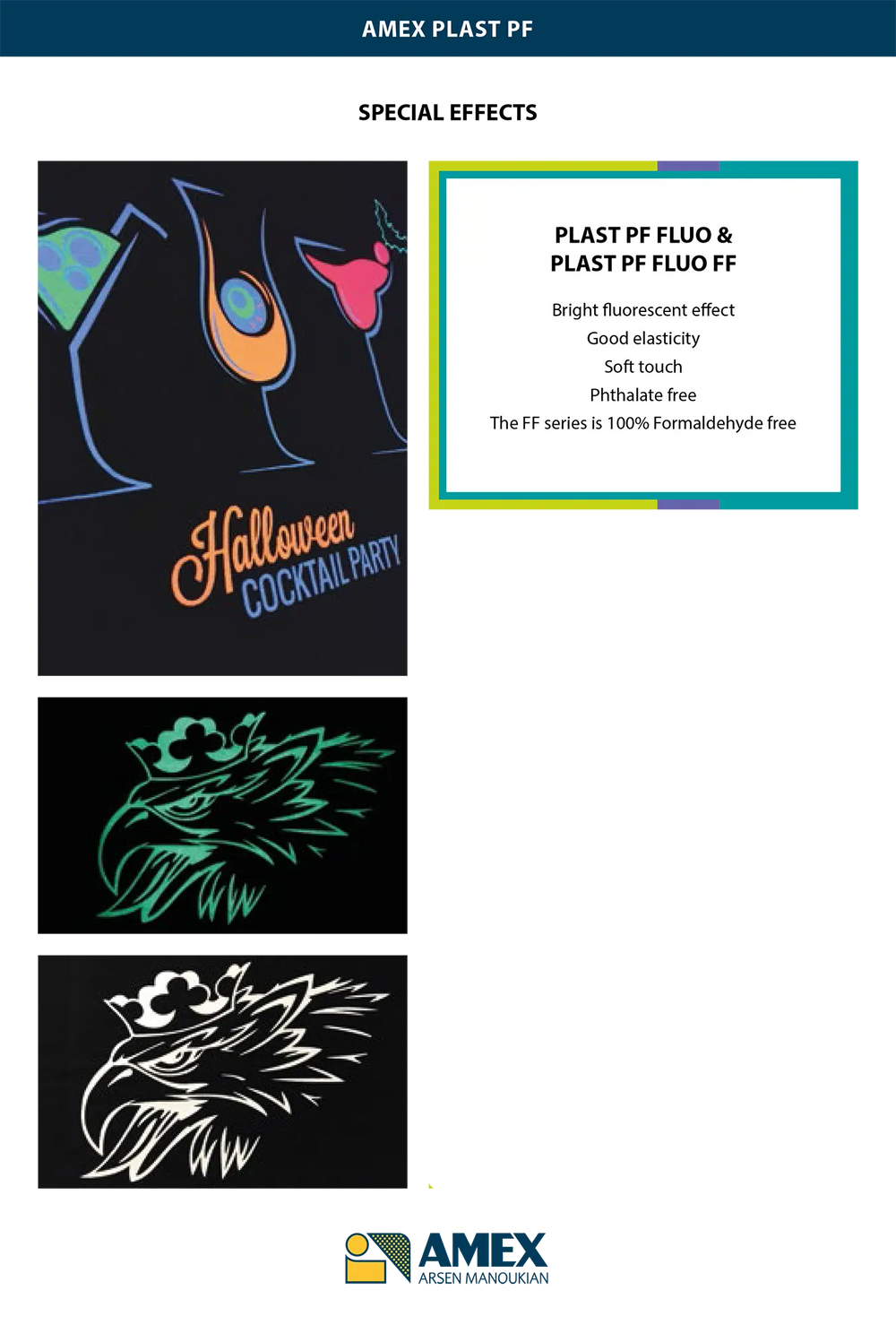 Le département de recherche chimique AMEX MANOUKIAN utilise des technologies de pointe et des matières premières de haute qualité, dans le respect de l'environnement. Les encres AMEX s'utilisent pour imprimer sur du tissu en coton, synthétique ou mélangé et sont sans phtalate.