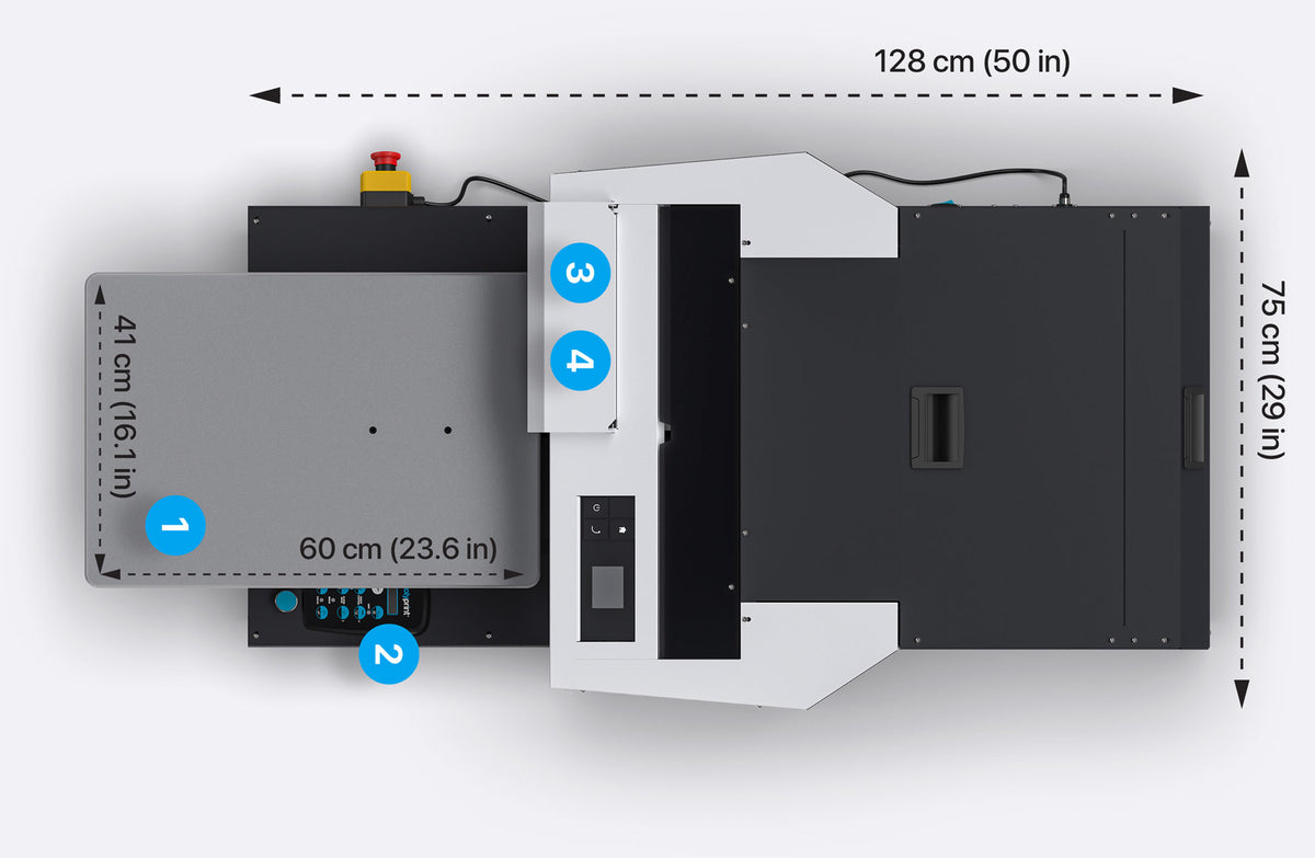 Avec une surface d'impression de 41×60 cm, 10 plateaux à changement rapide et la possibilité d'utiliser notre processus hybride*, cette machine est un choix polyvalent et économique, conçu pour simplifier l'expérience de la décoration des vêtements sans sacrifier la qualité.