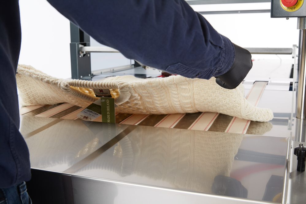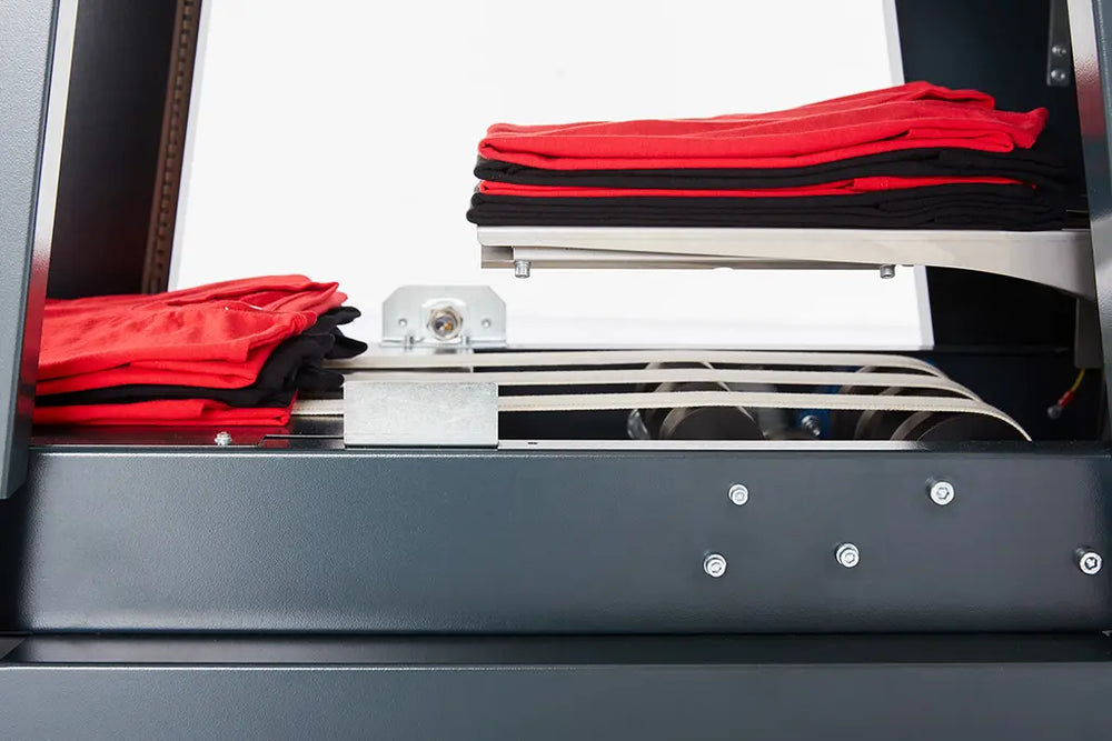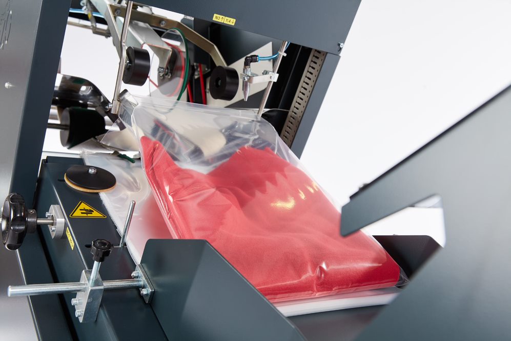 La STP1000 est une plieuse automatique pour vêtements prêts-à-porter qui réalise le pliage en un seul cycle de travail, rapidement, silencieusement et avec précision.